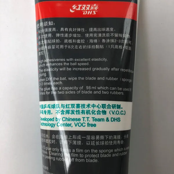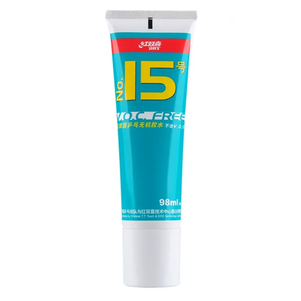 - چسب DHS No.15 محلول در آب است و توسط ITTF تأیید شده است. به دلیل خاصیت ارتجاعی و سهولت در پاک شدن در مقایسه با سایر چسب های تنیس روی میز بدون VOC متمایز و برتر است.