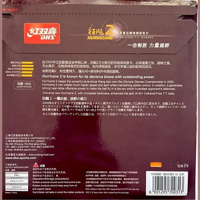 Hurricane 2 یکی از معروف ترین رویه های کمپانی بزرگ DHS است که بخاطر ضربات قاطع با قدرت فوق العاده مشهور شده است. قدرت بسیار زیاد، چرخش زیاد و کنترل پایدار، هاریکن 2 را در بین بازیکنان برتری که بر استراتژی حمله بر اساس ضربات تاپ اسپین از فاصله نزدیک میز و متوسط تمرکز دارند، بسیار محبوب می سازد.